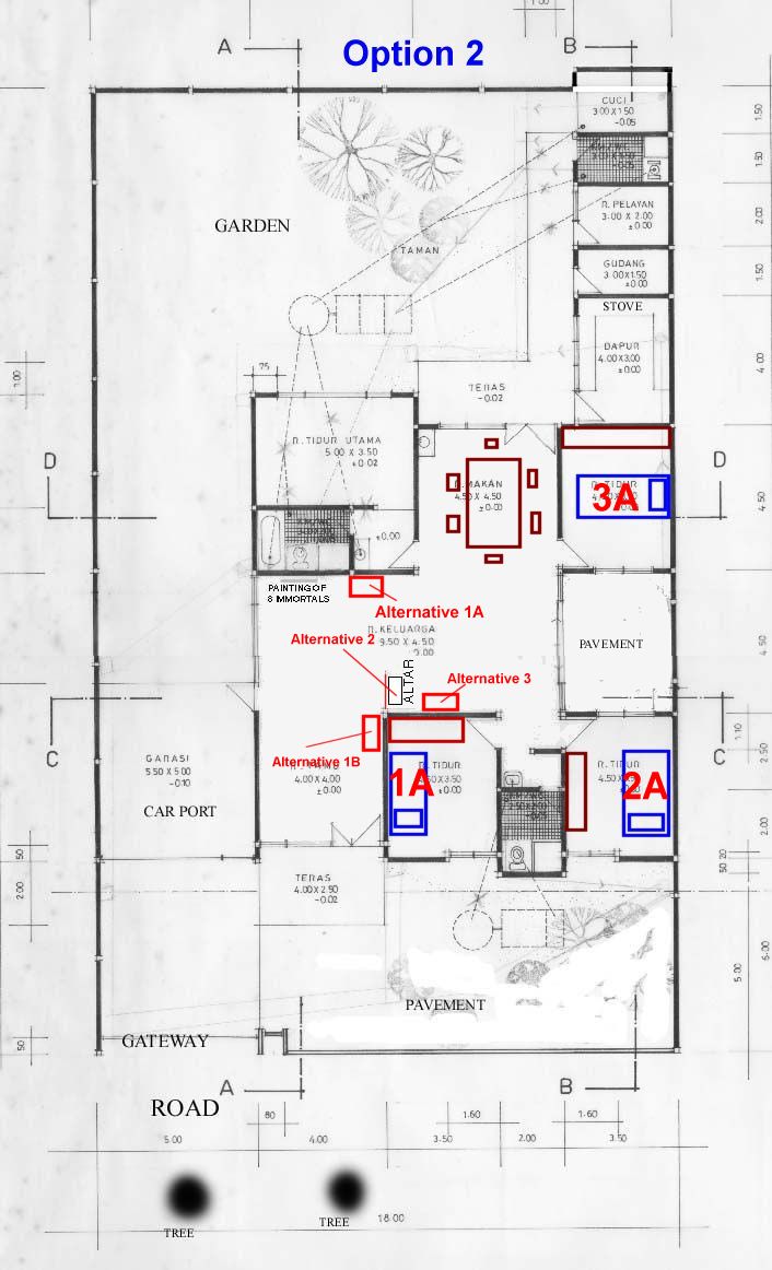 Alternative 1A is inauspicious IF it faces the main door. (From your past message, you mentioned that you may want to tilt the main door entrance. If so, this spot may be considered afterwards.